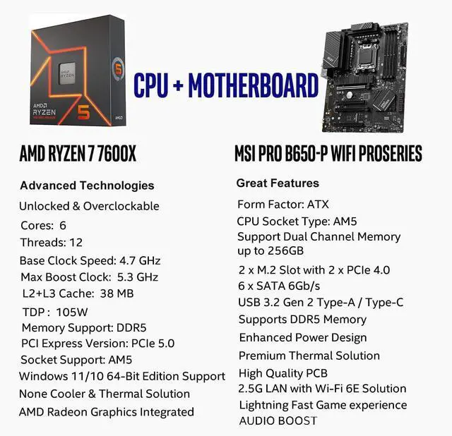 Support AM5 CPU Socket, can support PCIe 5.0 on select 600 Series motherboards. OS Support: Windows 11/ 10-64-Bit Edition. AMD Radeon Graphics Integrated, Cooler & Thermal Solution (PIB) not included