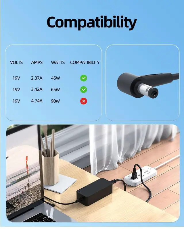 Output:19V 3.42A 65W (Compatible with 19V 2.15A/2.37A 40W/45W) Input:100-240V 50-65Hz