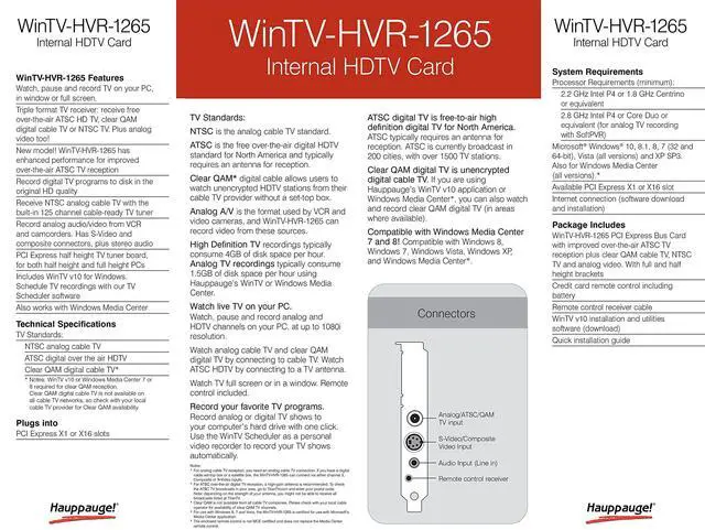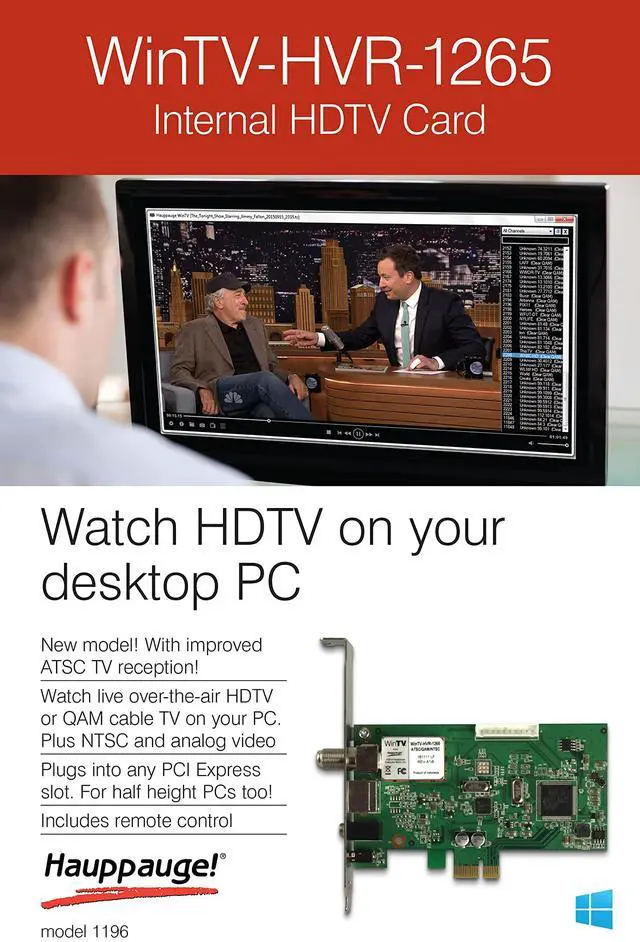 The Hauppauge WinTV-HVR-1265 model 1196 TV Tuner Card allows you to watch, pause and record HDTV or analog TV on your desktop PC. Plugs into a x1 or x16 PCI Express slot, full height or half height and includes remote control.