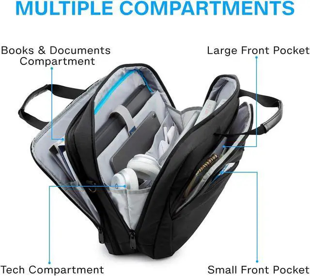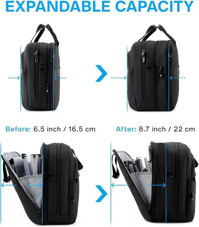 Multi Compartments with Expansion: Dimensions - 19.3" L x 6.5'' (up to 8.7'') W x 14.5" H; weight: 2.4 lbs. This versatile laptop briefcase transforms into a duffel bag using the expansion zipper. It offers up to 4 compartments, including a tech compartment for 18-18.4 inch laptops, two front pockets for essentials, and an expandable document compartment for A4 items. Stay organized and adaptable during your travels