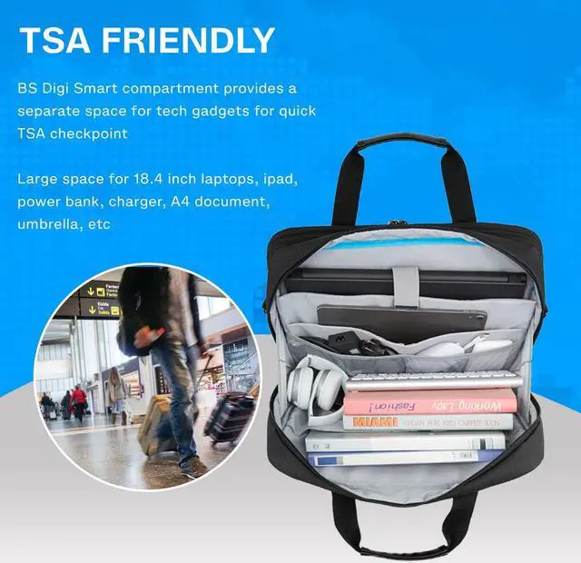 TSA-friendly & Anti-theft Features: Streamlined for hassle-free checkpoints. The dedicated tech compartment boasts a spacious opening, allowing you to breeze through airport security while keeping your laptop, 12.9'' iPad, and other tech gadgets organized. The inclusion of sturdy metal anti-theft zippers enhances the overall security of the computer bag