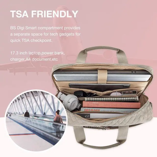 PERFECT CAPACITY & MULTIPLE COMPARTMENTS- 17"L x 4.5"W x 12.5"H; weight: 1.72 lbs, perfect to throw under seat on an airplane. Three compartments to meet all your needs well. The large tech compartment can fit 17.3 inch laptop as 12.9 inch iPad and other tech accessories. Two front pockets allow you to put your daily necessities conveniently. And one large storage compartment can storage your pens, books, passport in an organized manner. ^^ TSA FRIENDLY- Convenient at checkpoint. A separate tech compartment with large opening design can make you quickly pass at airport security, and three pockets in main compartment also keep your tech gadgets tidy. ^^ COMFY & ORAGANIZER POCKETS- Adjustable and "C" curve padded ergonomic shoulder strap relieves stress of shoulder; padded vegan leather handles offer light-weight carrying; luggage strap allows messenger to slide over the luggage tube; and lost of organized pockets aim to ensure a easy business trip or daily commuting. ^^ LAPTOP PROTECTION- The dedicated laptop compartment is fully padded. Laptop case can offer the optimal protection for your 17 inch laptop. You don't need to worry about your notebook getting crashed on the travelling. ^^ LONG LASTING- Made of durable water resistant polyester fabric, with metal zippers to provide a sturdy and reliant using experience.