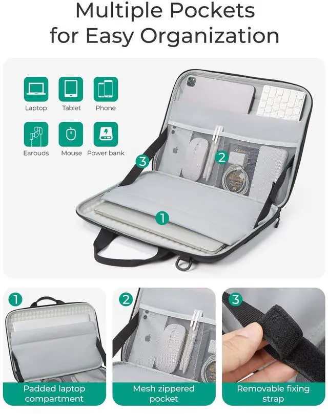 : Every detail counts, and weve got you covered! This laptop case features secure magnetic clasps, reinforced handles, and smooth double zippers for effortless access. The luggage strap lets you slide it onto your suitcase, while the adjustable, detachable shoulder strap provides versatility for on-the-go professionals. Your comfort and privacy are our priorities, making this bag not just functional, but a delight to use every day ^^
