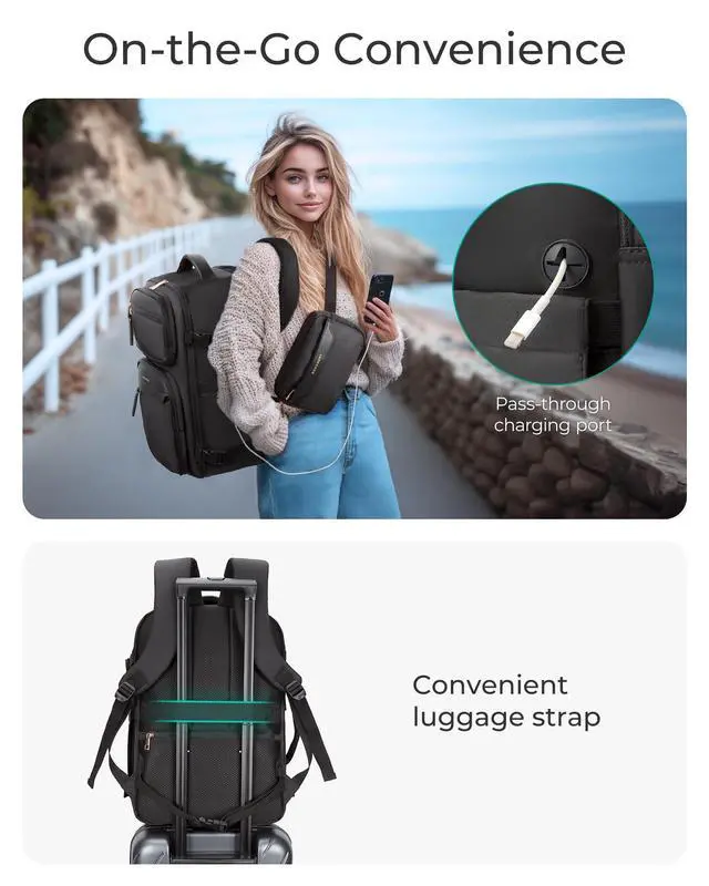 Airline-Friendly Size: This carry-on travel backpack is designed to comply with most airline personal item size requirements. Its soft-shell allow you to adjust the bags shape and avoid overpacking, helping it fit comfortably under the seat or in overhead compartments. Featuring an integrated data cable hole for convenient device charging on the go, plus a luggage pass-through strap for effortless attachment to your suitcase ^^