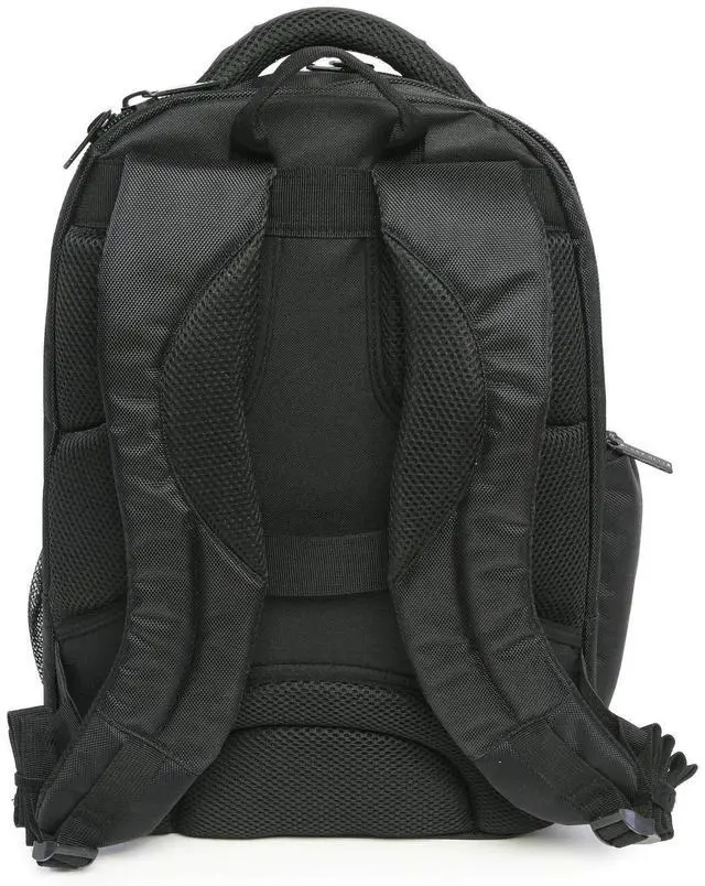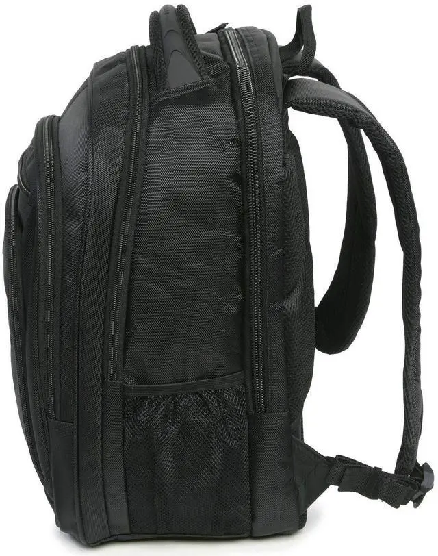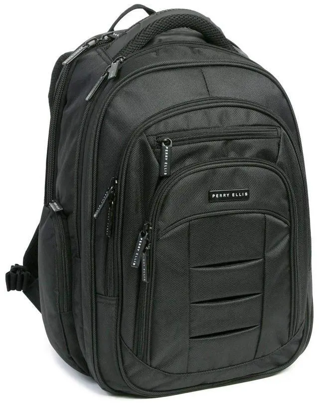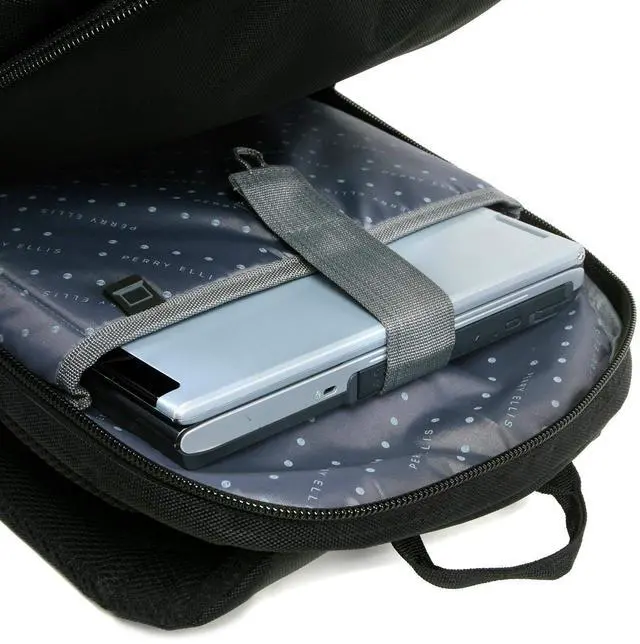 The Perry Ellis M150 Business Laptop Backpack is perfect for any business trip. The padded laptop compartment can fit a laptop with a 15" screen. 6 exterior pockets provide enough storage space for documents, cell phone, keys, business cards, and pens. Airport travel is made easy with a luggage strap located on the back of the backpack.