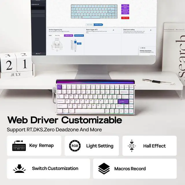 Analog Keyboard with Stunning RGB Neon Lightbox and Backlit: With a unique RGB neon light box design, creating a soft and uniform ambient lighting effect. Whether it's an intense gaming session or late-night office work, the lighting can enhance the atmosphere through light and shadow, increasing the sense of presence in the scene. The combination of the pre-key south-facing LEDs and the shine-through keycaps significantly enhances the visibility of the keys under different lighting conditions. Even in a dim environment, users can clearly identify the characters on the keys, improving the accuracy and efficiency of input.