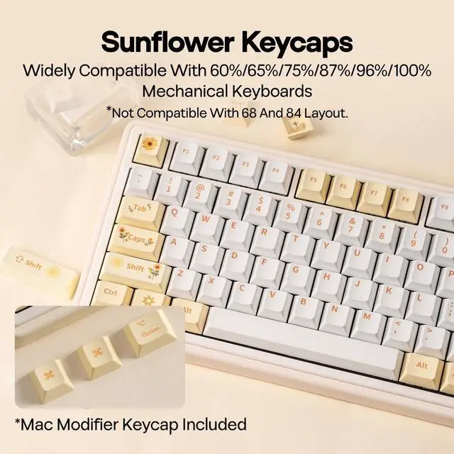 Mac Modifier Keycap Included: Designed for versatility, the Sunflower Keycap Set is specially equipped with modifier keycaps intended for Mac, covering essential keys such as Command (), Option (), Control (), and Function (fn). The set takes into full account the unique keyboard layout and functional requirements of macOS, aiming to restore the familiar tactile experience for Mac users while providing an optimized typing experience ^^