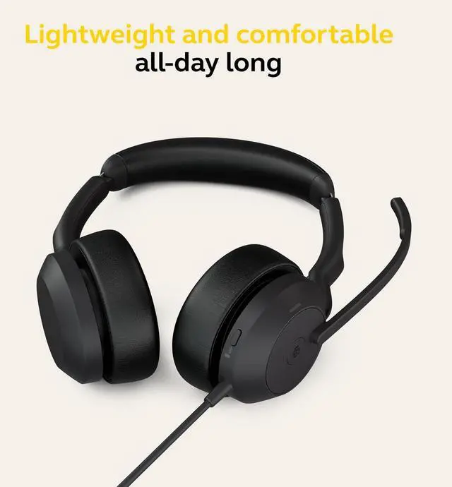 Maintaining professionalism, while hybrid working, can be challenging. Our Jabra Evolve2 50 Mono Wired headset keeps you focused and enables hybrid working from anywhere. Have crystal-clear conversations thanks to the 2 noise-cancelling microphones and the integrated Active Noise Cancellation (ANC) which suppresses ambient noises. The integrated 360 Busylight signals to colleagues when you're on a call and for a seamless collaboration experience, the headset with mic is also certified for Microsoft Teams - equipped with an MS Teams button that allows you to join meetings quickly and easily. The ultra-soft, lightweight headband with rotating, flexible ear cup provides ultimate comfort, and the over ear headset's dual-connectivity feature lets you connect to both your laptop and your phone via Bluetooth.