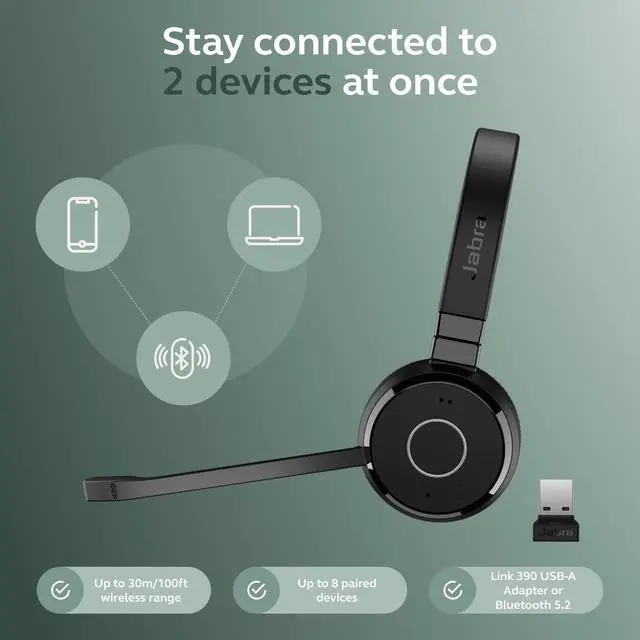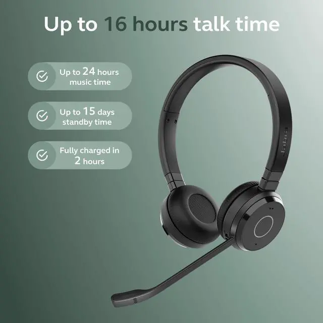 Stay wirelessly connected with the 30-meter/100-feet operating range thanks to the Link 390 Bluetooth adapter. With a charging time of 120 minutes, enjoy up to 16 hours of talk time for a long-lasting call experience. Standby time of up to 15 days. Download Jabra Direct desktop app with the easy-to-use Direct Dashboard or the Jabra+ mobile app - that way, you'll always have the latest features and updates. Jabra Technology for lifes rhythm. Whatever youve got going on, weve got just the thing. So find your rhythm and start enjoying life on your own terms.