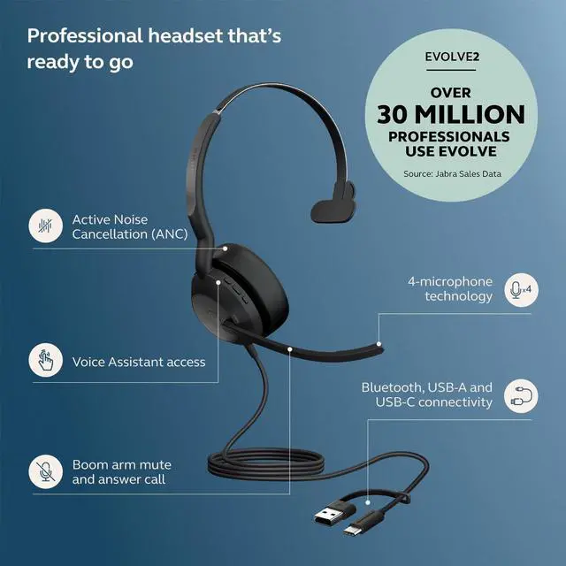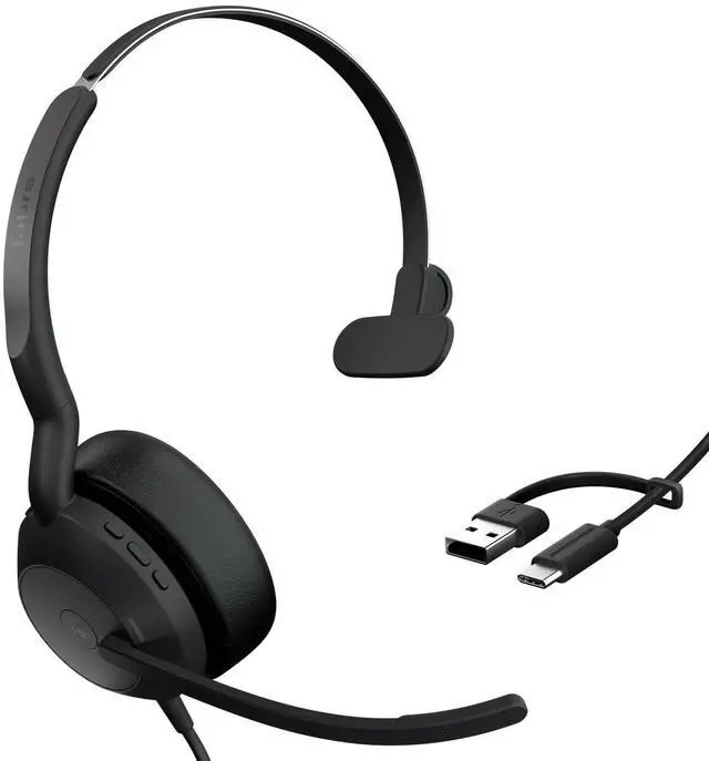 Introducing the Jabra Evolve2 50, our work headset with mic that seamlessly blends productivity and comfort for the modern professional. Designed specifically for small to medium businesses, these pc headphones are your perfect companion for both work and leisure. Whether you're participating in high-stakes meetings or enjoying your favorite tunes, these work headphones have got you covered. Experience the power of active noise cancellation and noise cancelling microphones that ensure crystal-clear communication, even in busy environments. The Jabra Evolve2 50 is a noise cancelling headset featuring both wired and Bluetooth connectivity options, allowing you to connect up to two devices simultaneously.