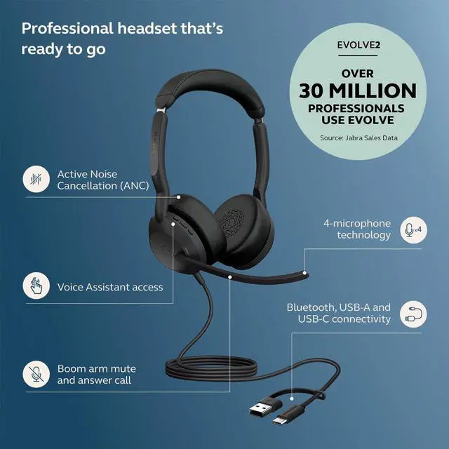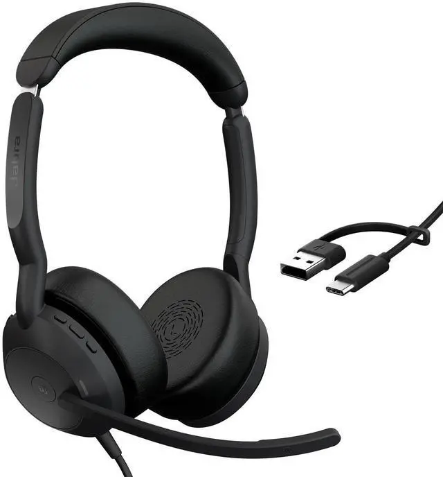 Introducing the Jabra Evolve2 50, our work headset with mic that seamlessly blends productivity and comfort for the modern professional. Designed specifically for small to medium businesses, these pc headphones are your perfect companion for both work and leisure. Whether you're participating in high-stakes meetings or enjoying your favorite tunes, these work headphones have got you covered. Experience the power of active noise cancellation and noise cancelling microphones that ensure crystal-clear communication, even in busy environments. The Jabra Evolve2 50 is a noise cancelling headset featuring both wired and Bluetooth connectivity options, allowing you to connect up to two devices simultaneously.