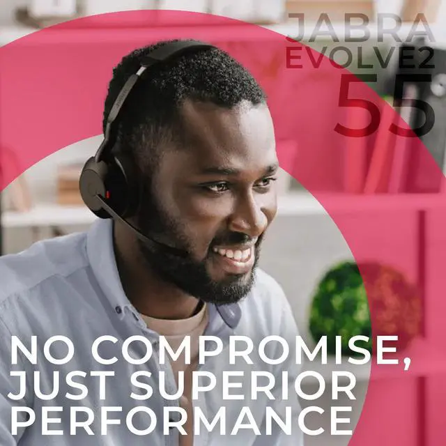 ^^ ALL DAY COMFORT: The Jabra Evolve2 55 is designed to be your companion throughout the day without compromising on comfort. Featuring groundbreaking Jabra Air Comfort technology, it's crafted to alleviate pressure. Inside the cushioned headband, you'll find layers of ultra-soft perforated foam, and the earcups are both flexible and rotating, offering a unique comfort-enhancing pattern for a gentle fit and unparalleled comfort, ensuring you can work in complete ease.
