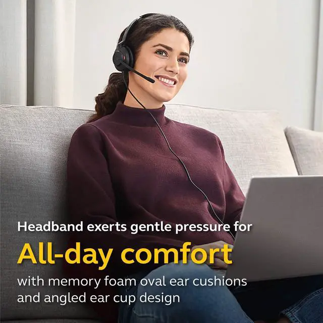 Plus, this mic headset automatically knows when you need peace and quiet. An integrated busylight turns on automatically when youre on a call or you can turn it on manually to signal do not disturb mode. To get ahead, we measured heads. Hundreds of them. Then we used that data to design the perfect shape using biometric measurements. The result is a call center headset thats been ergonomically designed to exert just the right amount of evenly distributed pressure for all-day comfort. Built with premium materials, the soft memory foam ear cushions mold to your ears natural contours to create a work headset that wont weigh you down.