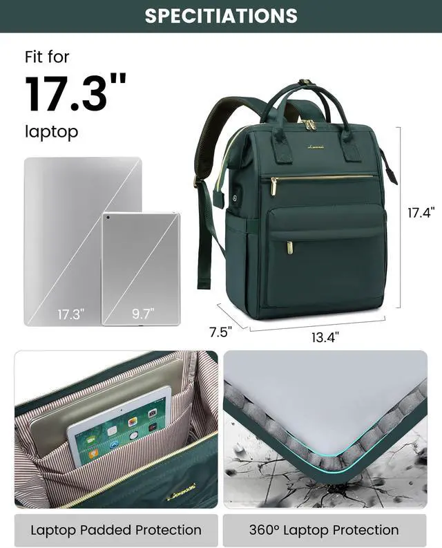 LAPTOP PROTECTIONDesigned with dedicated compartments for a 17-inch laptop and a 12.9-inch iPad, this women's work backpack features cushioned pockets, offering superior protection for your electronics.