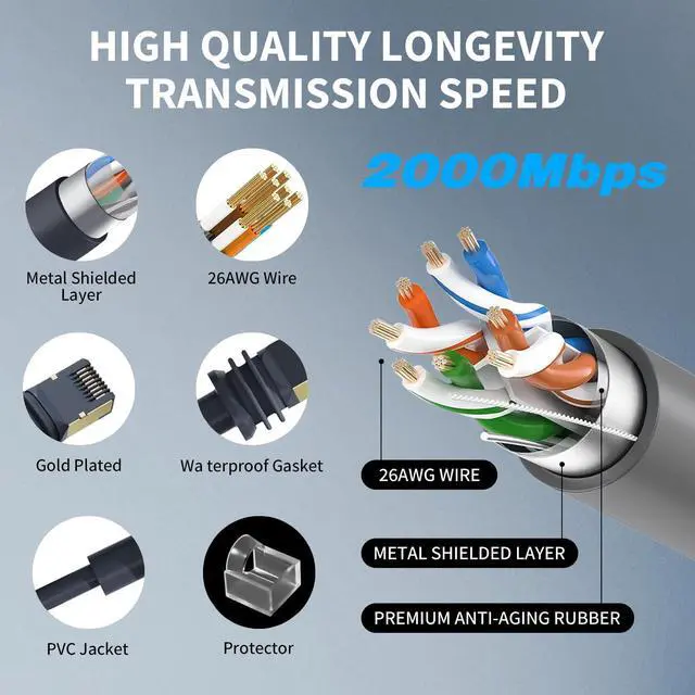 Starlink v3 cable 50FT cat6 data transfer speed up to 2000Mbps, made of quality 26AWG Multi-core copper with metal shielded layer and sturdy PVC jacket for both indoor and outdoor stable network supply, provides streaming without lag for server applications and online high-definition video streaming etc.