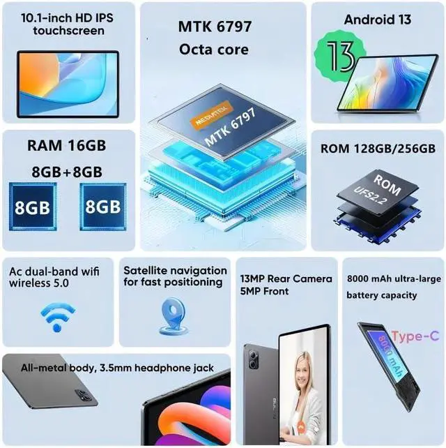 Android 13 OS & 16GB RAM 128GB ROMThe TYD-109pro android tablet runs on Android 13.0 system and is loaded with an 16GB RAM8GB+8GB and 128GB of ROM for storing all your apps, files, and media. This tablet is perfect for playing large games and loading large data. It has lightning-fast speed and smooth performance. You will find that web pages load without any lagging and apps open in a snap. Whether you're streaming videos, playing games or working on important documents, this tablet handles every task easily.