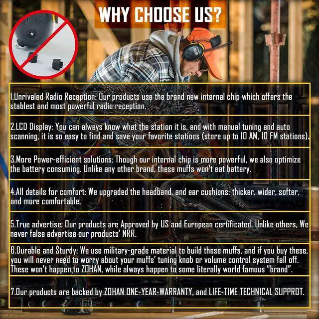 ZOHAN EM042 headphone: Noise Reduction Rating (NRR) of 24dB. Digital AM/FM radio tuning with LCD display.Store up to 10 AM and 10 FM stations in memory. Besides, auto-scanning helps you quickly find and save your favorite stations.