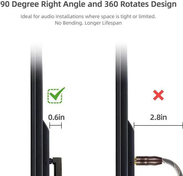 Considerate 90 Degree Right Angle Toslink Digital Optical SPDIF Audio Cable: 360 Degree swivel adjustable right angled, Ideal for audio installations where space is tight or limited. The rotating head works better for small spaces between wall and devices
