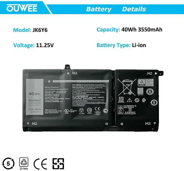 Specifications JK6Y6 battery for Dell Latitude Replacement Battery, Type: Li-ion; Our JK6Y6 Battery Replacement for Dell 40wh Standard JK6Y6 Rechargeable li-ion battery.Voltage: 11.25V; Capacity: 40Wh 3550mAh; Color: Black;Condition: New;