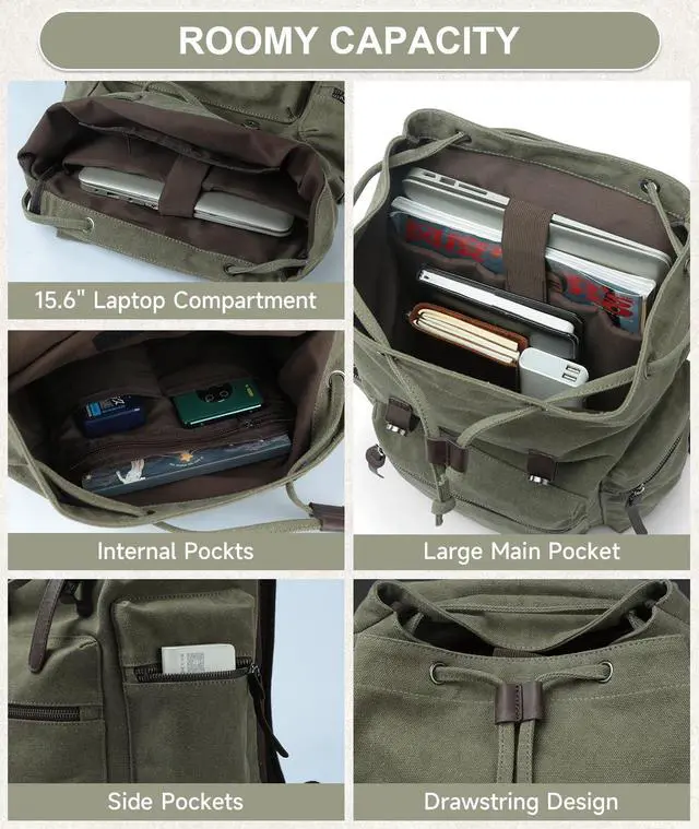 DURABLE&GOOD QUALITYThe MOYYI vintage canvas backpack is crafted from top-quality, high-density, long-lasting canvas fabric and leather. It showcases a flap and drawstring design, pairs with hardware accents, creating a laid-back retro style and ensuring security.