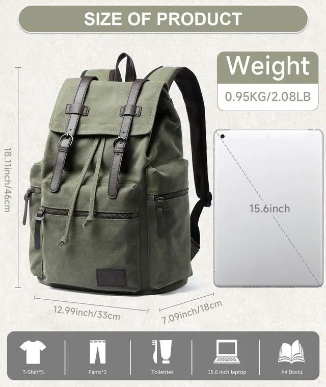 LARGE CAPACITYSize: 13.9*7.09*18.1"(L*W*H), Capacity is 28L, Net weight is 2.1lbs. The vintage daypack has a main compartment with a drawstring closure. It can hold clothes for short trips, A4 binders, and carry-on items and such. The separate pocket can accommodate up to a 15.6-inch laptop. The front pocket is for personal valuables like cell phones, keys, and purses.
