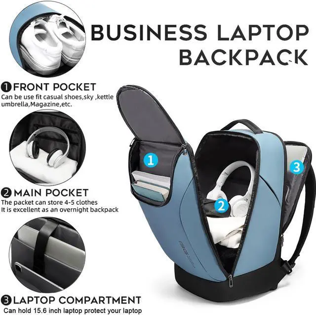 Multi-function pocketMultiple pocket designs180°opening pocketcan hold a lot of goodsin front pocketcan be use fit causal shoes,kettle umbrellamagazineetcIn main pocketpack the way you wantThe pocket can store 4-5 clothesit is excellent as an overnight backpackalso can used for business Travel and daily TravelIn laptop compartmentcan hold 15.6 inch laptop and protect your laptop