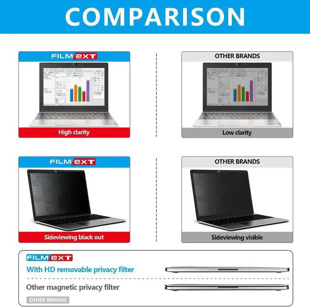 1. Upgrade Feature: FILMEXT privacy screen filter perfectly fit Macbook,Compatible New MacBook Pro 13.3 M2 2022/ M1(2021-2016) touch bar & non-touch bar(A2289 A2251 A2179) and 2018 Macbook Air 13.3"(A1932). latest research and development privacy filter with high clarity, it shows the same resolution viewing from the front side (NOT darker), feels comfortable and non-eye strain in long time using. Bubble free design with a silicone seal at border, it is removable and easy to put on or off.