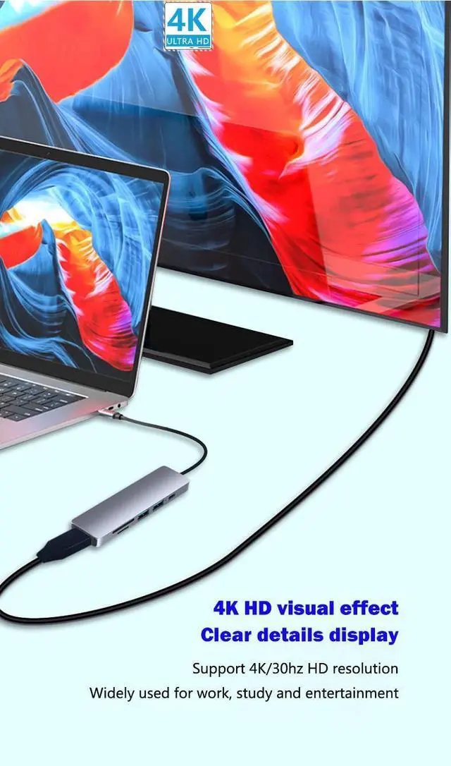 The USB-C 6-in-1 docking station is compatible with mobile phones and computers that have a USB interface with DISPLAY PORT protocol. It's a plug-and-play device that doesn't require additional power supply. With this docking station, you can easily connect your phone or computer to your TV, projector, or monitor, allowing you to project and share your mobile video and other content, such as TV shows, pictures, and browser content on the big screen. Sharing with family and friends has never been easier. Additionally, this docking station can connect multiple USB external devices, such as keyboards and mice, to solve the problem of new computers and mobile phones having only one interface. It can also be used for charging with PD chargers while in use.