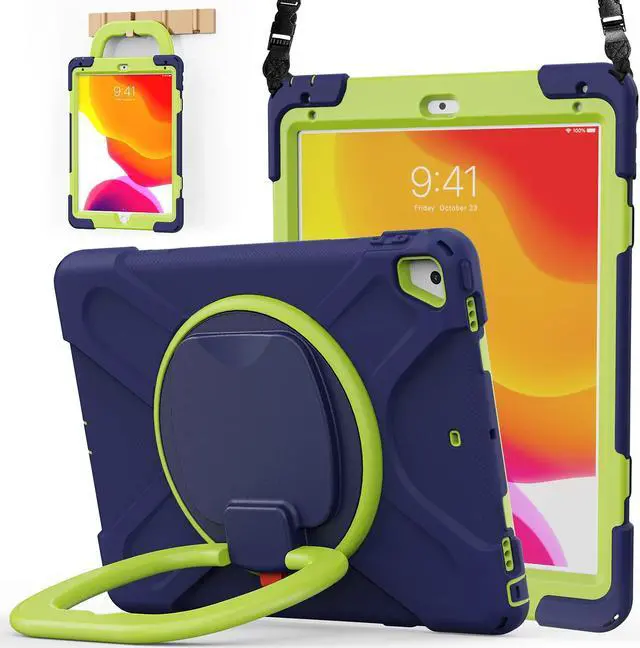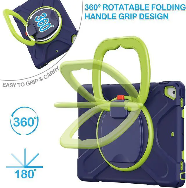 BATYUE Case for iPad 6th Generation 9.7 inch 2018, iPad 5th Gen 2017, iPad Air 2/ iPad Pro 9.7'',Shockproof Protective Cover with Pencil Holder &Rotating Bracket &Shoulder Strap (Navy Blue+Lime)