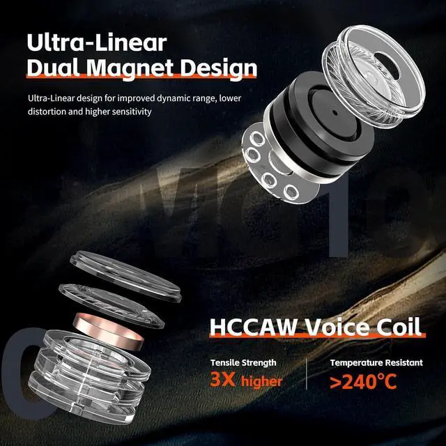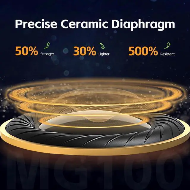 Precise Ceramic Diaphragm Dynamic Driver Earphones--Ceramic diaphragms are fairly rare even among high-end earphones, with their improved parameters being the key to High-fidelity sound. With MG100 we are packing the same advanced tech into earphones.The ceramic diaphragm with high tensile 0.035mm voice coil brings higher resolution and faster transients to the sound.