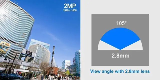This camera model works with 2MP or higher resolution DVR. This camera is 2 Megapixels high definition HD TVI/CVI/AHD/960H(1000 TVL), 65ft IR night vision range. It has a 2.8mm Fixed lens with 100 degree wide Field of View (FOV) to cover large areas