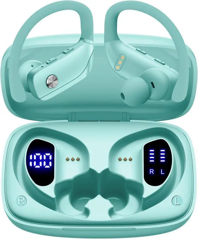 bmani 2 Sets Wireless Earbuds Bluetooth Headphones 48hrs Play Back Sport Earphones with LED Display Over-Ear Buds with Earhooks Built-in Mic Headset for Workout Sky Blue+Mint Green