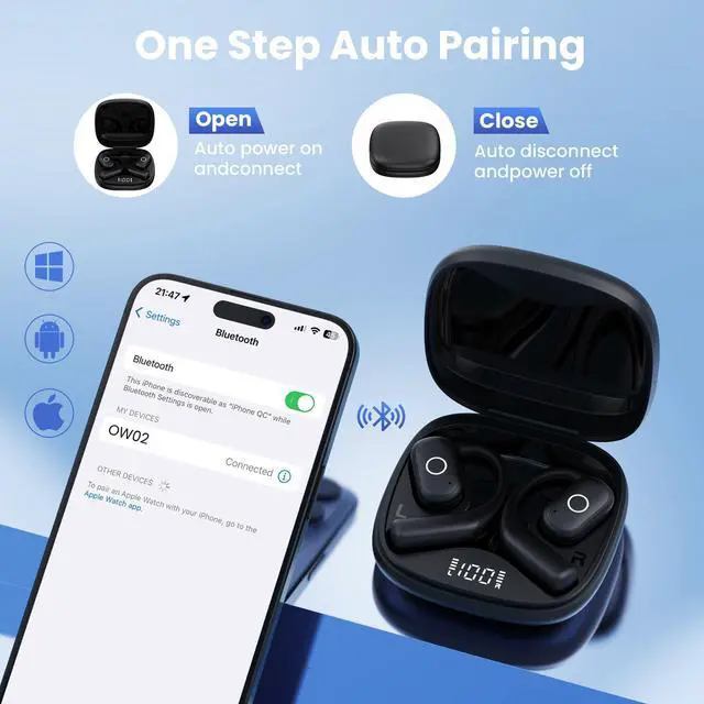 Portable Case & Smart Touch ControlWith a pocket design, the OW02 charging case is just 2.5 inches on its longest side, making it effortlessly portable for your daily on the go, work, or travel. Equipped with smart touch controls, these sport open earphones empower you to adjust volume, switch song, and answer calls seamlessly with just one handno need to reach for your phone.After first successful pairing, OW02 headphones wireless Bluetooth can connect with your device automatically when you open the charging case, which can support fast and quick pairing with your device.