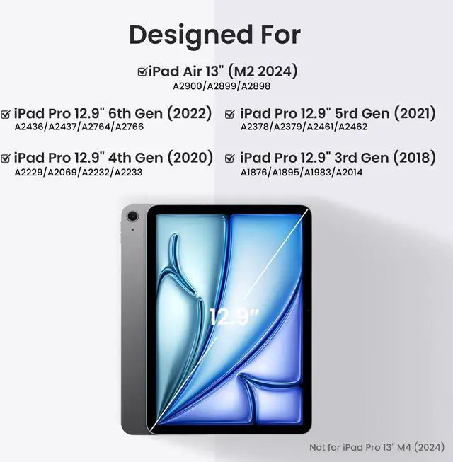 CompatibilityCompatible with iPad Pro 12.9 ( 6th/5th/4th/3rd gen), models include 2022 12.9 inch Pro 6th Gen, 2021 12.9 inch Pro 5th Generation (A2378, A2379, A2461, A2462); 2020 12.9 inch Pro 4th Generation (A2229, A2069, A2232, A2233); 2018 12.9 inch Pro 3rd Generation (A1876, A2014, A1895, A1983)