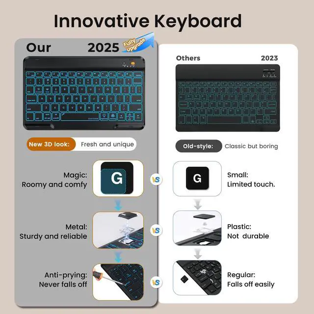 Detachable KeyboardOur keyboard case using a flip magnet separate design with built-in pencil holder giving you amazing versatility. Different angles of standing on the bottom of the cover to ensure a comfortable viewing angle - Typing, Reading, Gaming - Easily adjusts