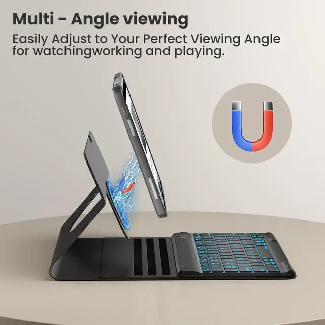 360 Rotatable MagnetciallyRemovable Shell & Wireless Bluetooth keyboard that transforms your iPad into a highly performant and easy to use laptop or your favorite book in less than a second. Layout with Hot keys Customized for iPads, Including Volume, Music Control, Brightness etc, with mute and ergonomic design, gives you a skin-like touch feeling and provides all-day comfort for work and entertainment