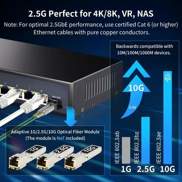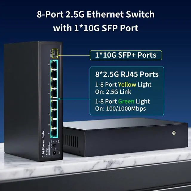 High-Performance 8-Port 2.5G Ethernet Switch with 10G SFP Port: This STEAMEMO unmanaged network switch features 8 x 2.5G Base-T ports and 1 x 10G SFP port, delivering fast and reliable connectivity with a 60Gbps switching capacity. Perfect for high-speed networking needs like NAS, 4K streaming, and gaming PCs.