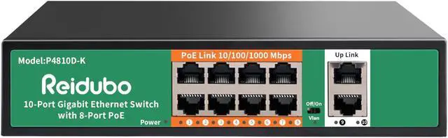 Full Gigabit Poe Switch & 120WThe Reidubo gigabit PoE ethernet switch with 2-gigabit uplink ports and 8*10/100/1000 Mbps Base-TX RJ45 ports can transmit data and power at the same time. Reidubo network switch offers whole 120W PoE power output but the maximum power for each port is up to 30W. The 2-gigabit uplink port can connect to NVR, other switches, routers, access point (AP), mesh, wifi 6, etc. A wide range of connection options to meet your various Internet needs.