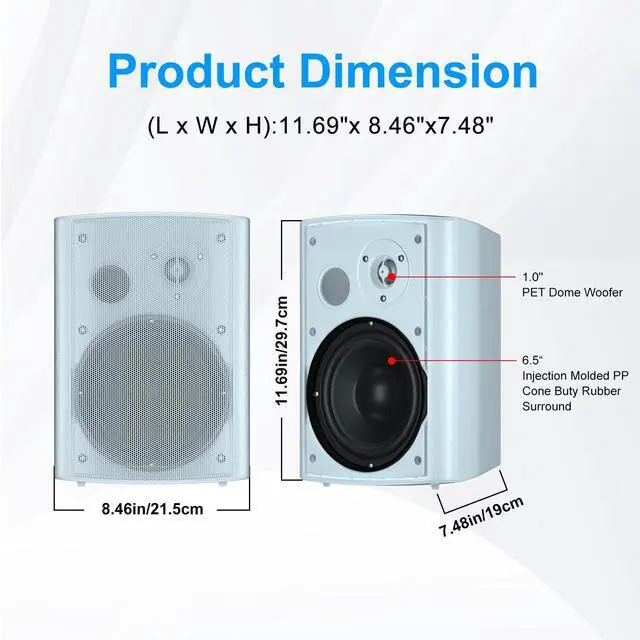 WATERPROOF CONSTRUCTION:With a rating of IP44, the Wall mount speakers are made with heavy-duty ABS construction and are marine grade waterproof making them to use in any open places.Excellent for use on boats/ marine/ decks/ patios/ pool