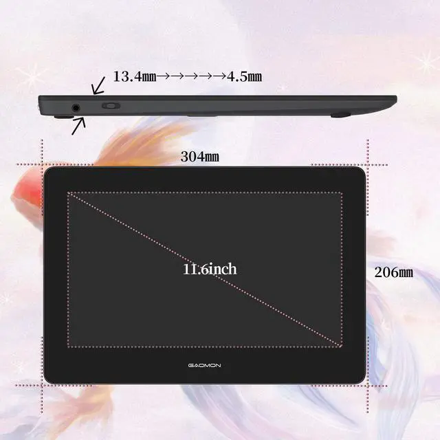 11.6-Inch Monitor & 86% NTSC Gamut11.6- inch Full Lamination Pen Display with 86% NTSC Gamut,16.7M(8bit) million Colors gradation, 1920 x 108016:9solutions and a viewing angle of 178°, it presents the lifelike details of your artwork with accuracy, delivers incredible visual clarity and color saturation.
