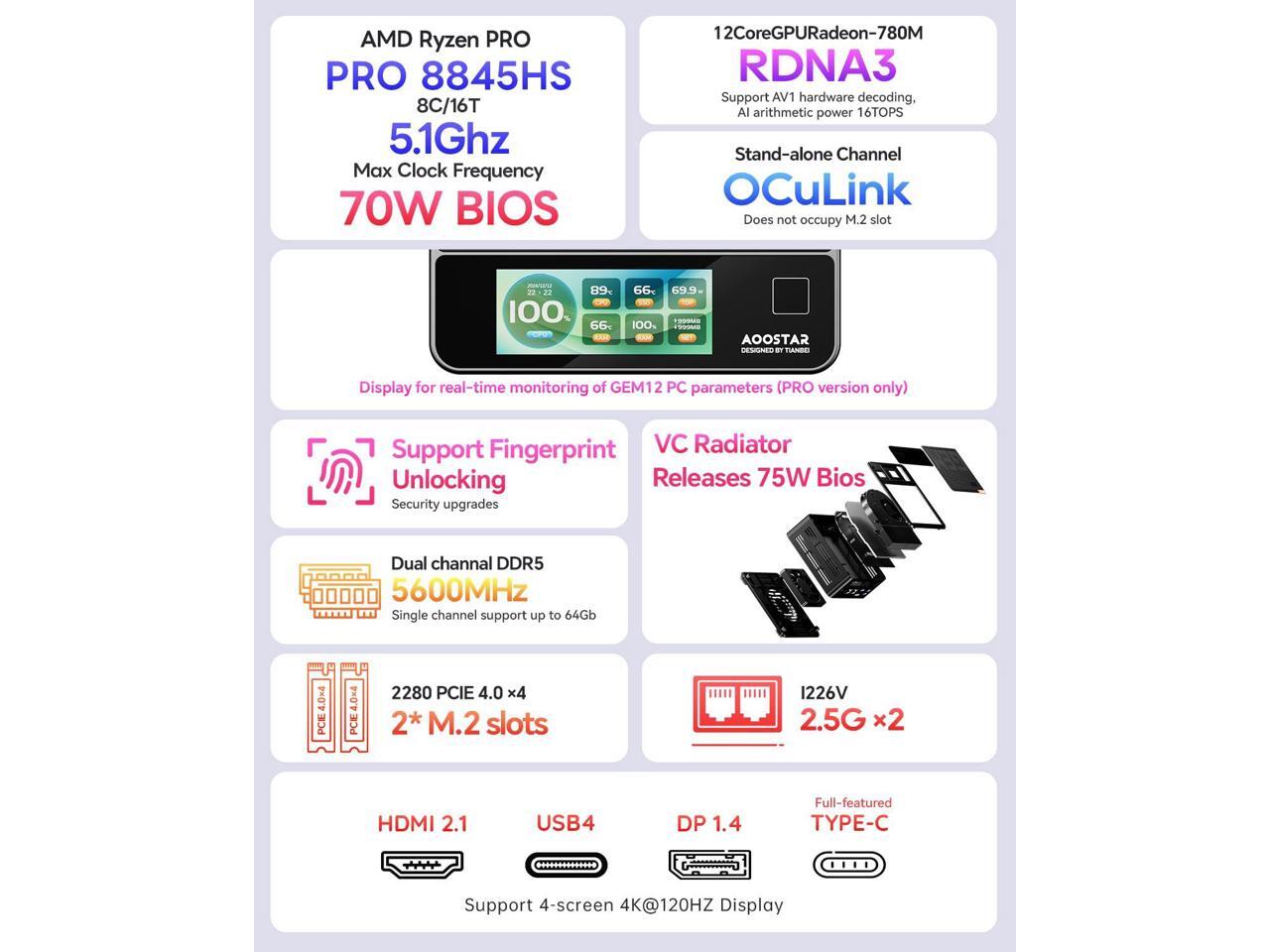 AOOSTAR GEM12 + PRO GEM12 8845HS Mini PC, 32GB DDR5 5600Mhz RAM 1T SSD Mini Gaming PC with OCULINK/ 2*USB4(PD|8K@60Hz)/HDMI2.1/1 xDP 1.4, 2X 2.5G LAN,2*M.2 SlotsDIY Display+Fingerprint Recognition