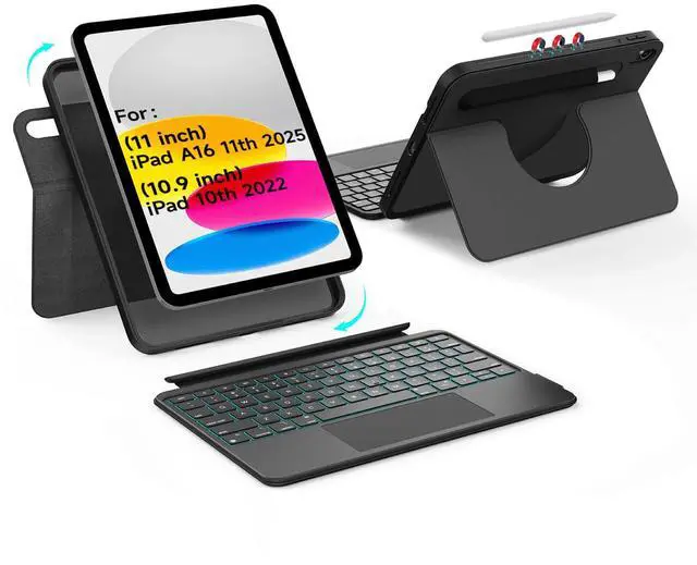 accrosoo iPad A16 11th/10th Gen Rotatable Detachable Magnetic Keyboard Case with Larger-Touch Trackpad, Shockproof Bumper, Support Portrait, Magnetic Pencil Holder, Full Protect, 7 Backlights