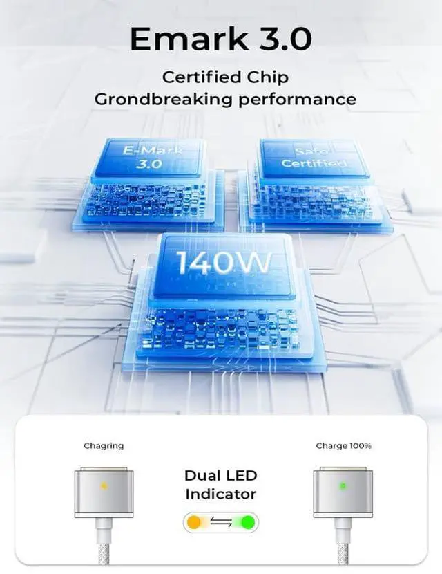 140W PD 3.1 SUPER FAST CHARGING: This Magnetic Gen 3 charging cable delivers 140W PD 3.1 super fast charging speed as OEMs, this macbook pro charger cord powers your MacBook efficiently with a 96W or 140W adapter, reaching 50% in just 30 minutes. NOTE:While using certain power adapters, a slight 15-20 second delay in the charging process might occur due to our magnetic safety mechanism, but rest assured, it's a sign that your laptop is being well-protected