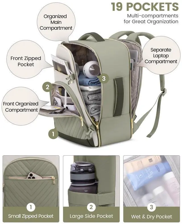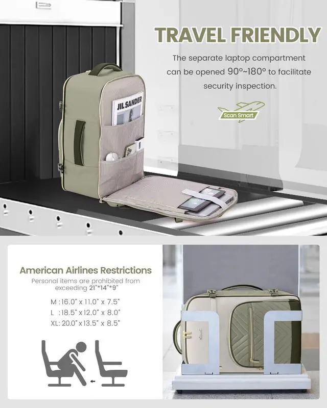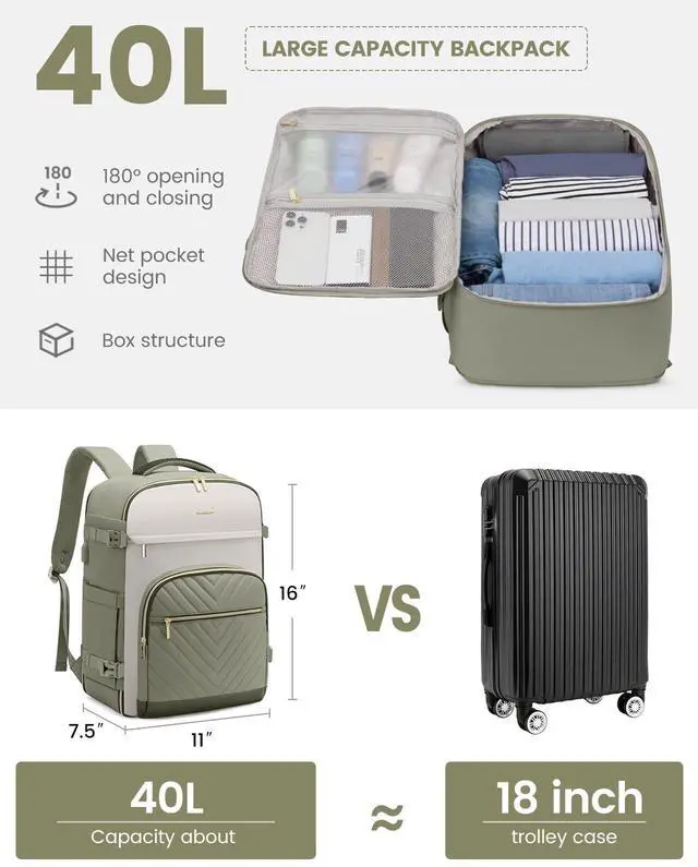 This large women's travel backpack combines a 40-liter capacity with a multifunctional design to meet the needs of 3-6 day trips, while also featuring conveniences designed for air travel, such as a TSA-friendly layout and dimensions that comply with the standards of multiple airlines, ensuring both style and practicality during your journey. Made from durable, waterproof polyester, the backpack not only offers excellent breathability and heat dissipation but also provides an anti-theft pocket and various carrying options, making it an ideal choice for business trips, outdoor adventures, or daily commutes.