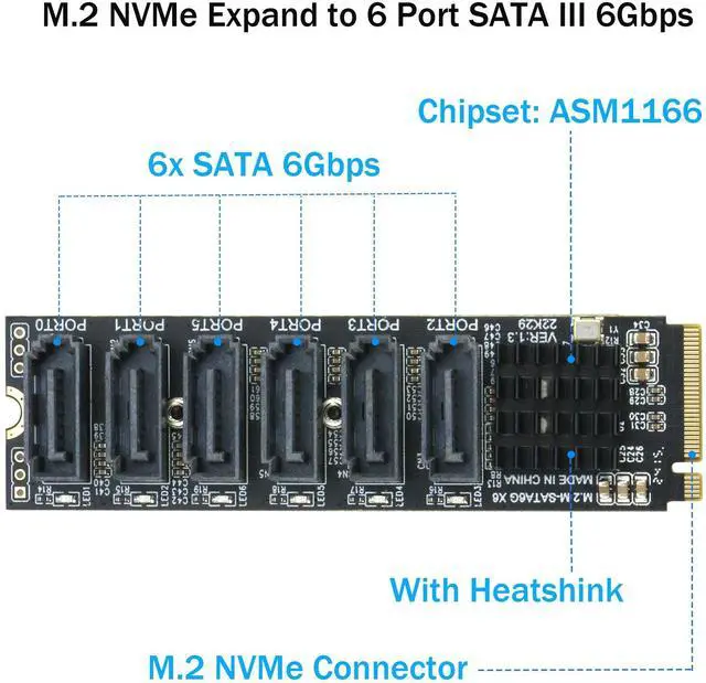 M. 2 to SATA 3.0 Adapter [6-Port], RIITOP M. 2 NVMe to 6 Ports SATA III Expansion Card Adapter 6Gbps with Chipset ASM1166