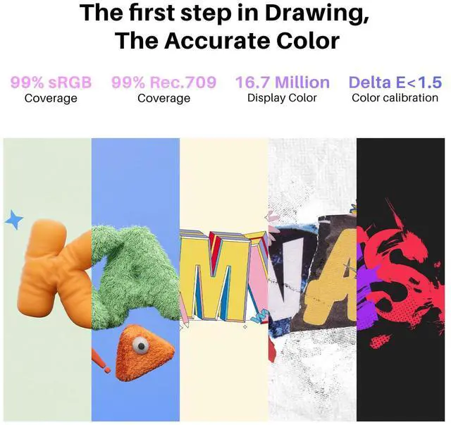 [Accurate Color Display] Kamvas 16 (Gen 3) digital art tablet boasts a high-quality screen that covers 99% of the sRGB and Rec.709 color gamuts, as well as 90% of the Adobe RGB color gamut. E<1.5 ensures accurate color representation.
