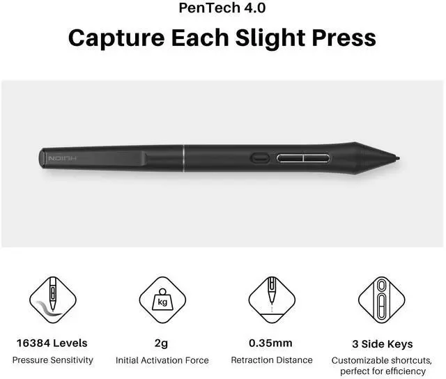 [Advanced PenTech 4.0] PenTech 4.0 delivers a 2g initial activation force, 16384 levels of pen pressure and ±60°Tilt Support. The smaller nib and tilt auto-alignment can help designer track the mouse and reduce parallax.