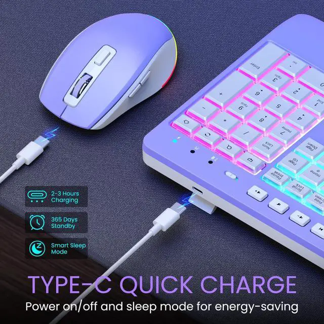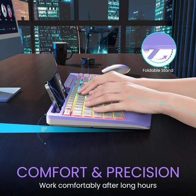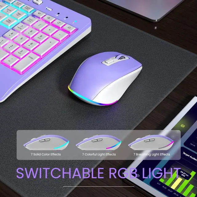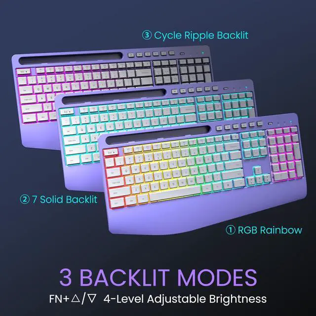 LIGH UP WORK-LIFE: Personalize your own RGB keyboard mouse combo. Switch 3 lighting modes, 7+1 backlight colors and 3-level brightness to match your mood, enhancing immersion at work. Lighting also can improve visibility in dark environments and improve typing accuracy.