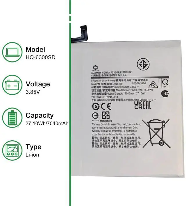 • Model: HQ-6300SD // Voltage: 3.85V // Capacity: 27.10Wh 7040mAh // Color: Black // Type: Plug & Play Li-ion Battery.