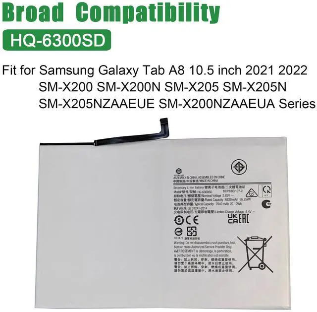 JIAZIJIA HQ-6300SD Laptop Battery Replacement for Samsung Galaxy Tab A8 10.5 inch 2021 2022 SM-X200 SM-X200N SM-X205 SM-X205N SM-X205NZAAEUE SM-X200NZAAEUA Series HQ-6300SA 3.85V 27.10W h 7040mAh